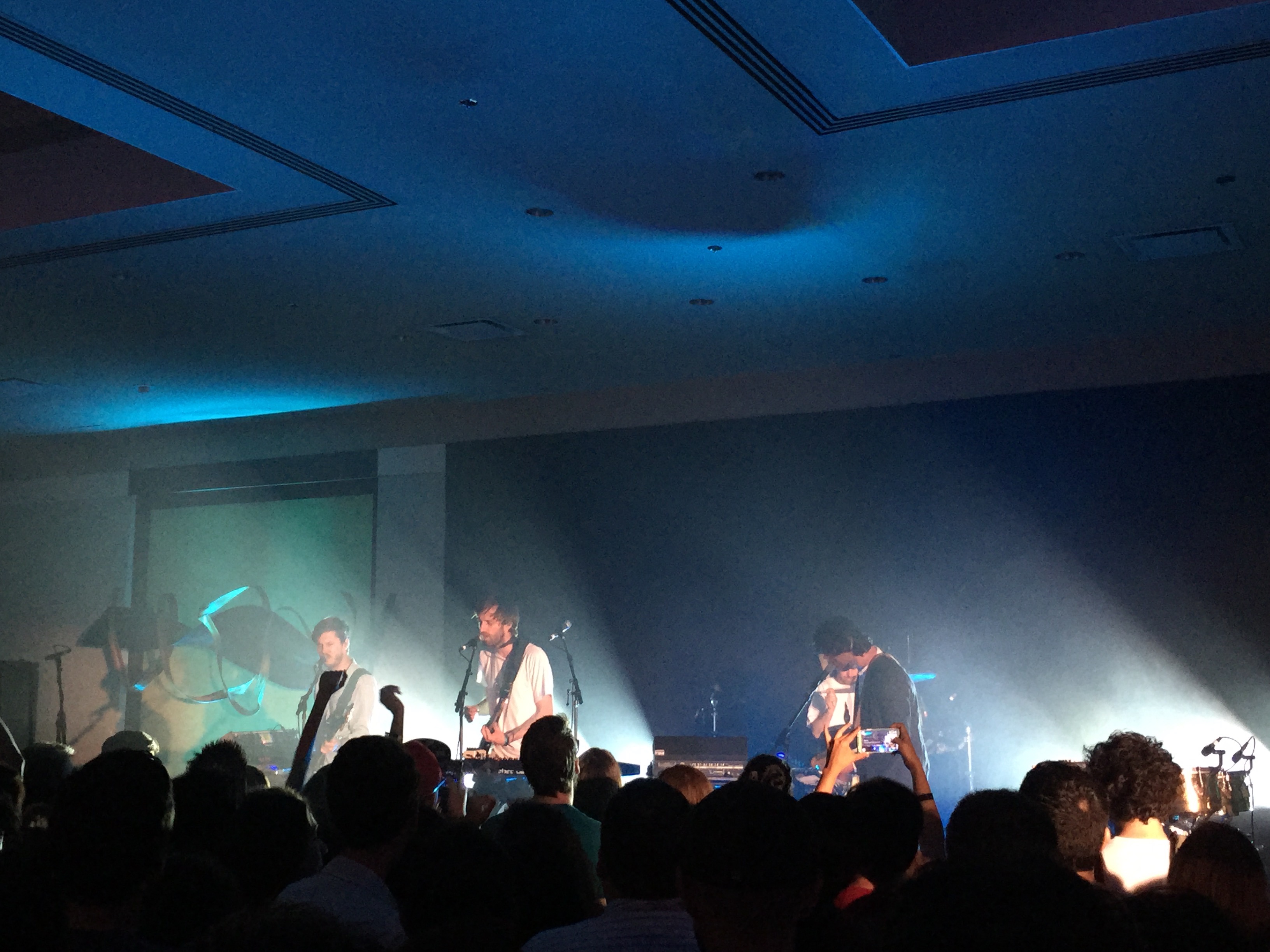 We arrive at the Renaissance Hotel early. Entry only required an online reservation so I don’t mind waiting in a brief line. I’ll gladly exchange a little time for an opportunity to see Cut Copy for free. We receive wrist bands and a complementary Renaissance Hotel portable battery pack with a forgivably useless micro-USB cable. Never look a gift charger in the cable, that’s what I always say. We ascend two flights of escalators and enter a ballroom. We receive a card informing us of the proper profiles and hashtags for the event. There is soft purple and green up-lighting and stations around the back of the room with large glowing white signs that read ‘SHOP’, ‘SIP’, ‘SEE’, and ‘SAVOR’. Women in black dresses and men in black suits bustle around the room. The beer line is long and slow. There is no line for the free artisanal pizza. I start to soak in the rest of the room. Designer hand bags are on sale at a pop up shop in one corner. There are free chicken wings and donuts in another. No one is standing within 50 feet of the stage at the far end of the room.